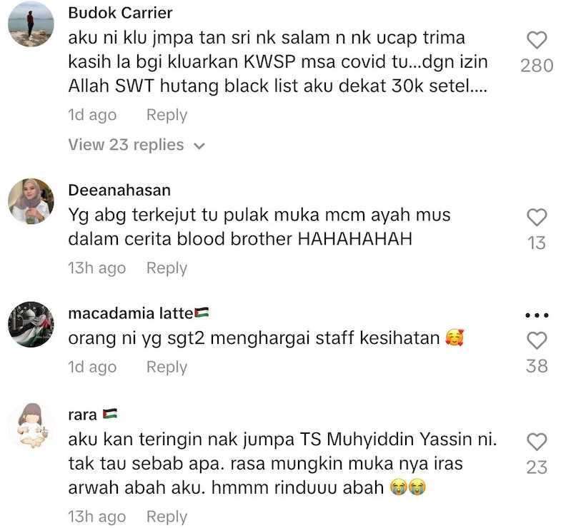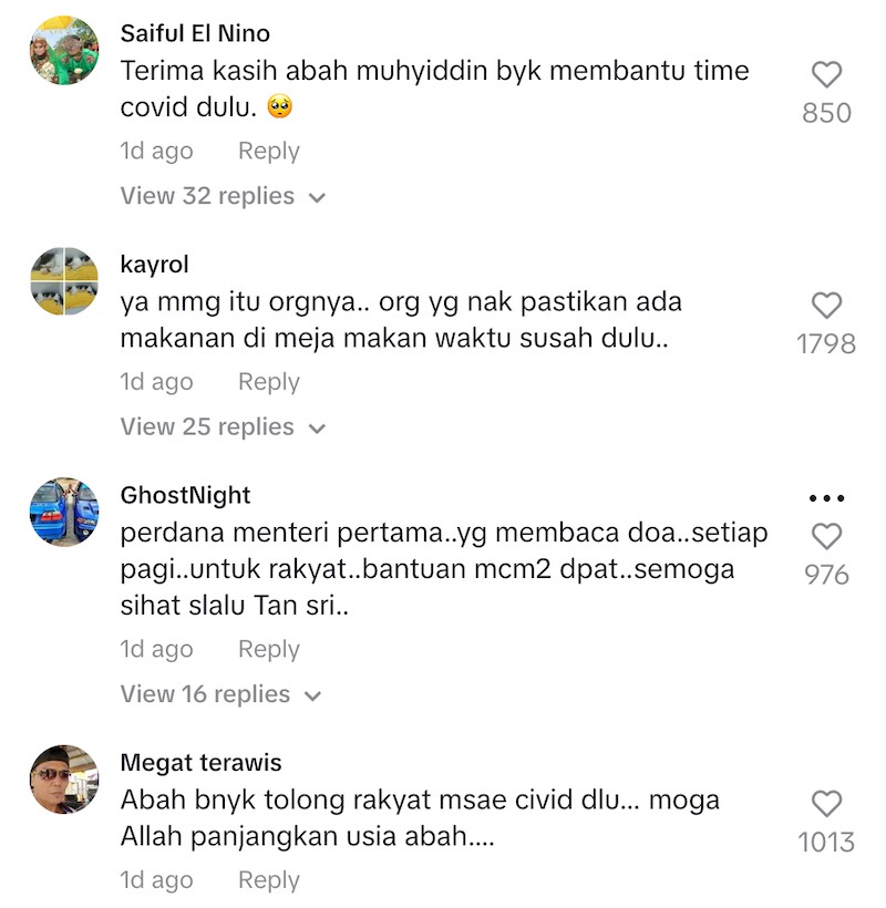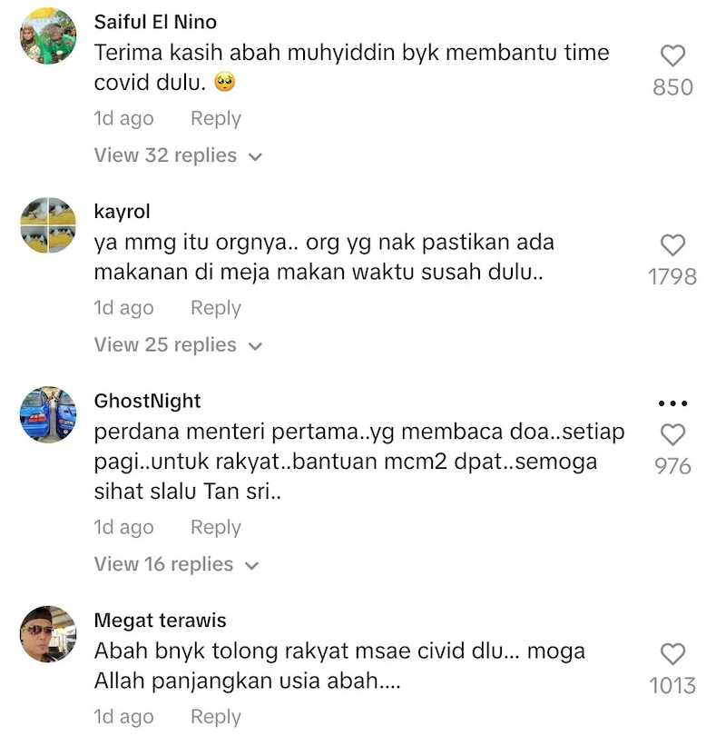 Menjengah ke ruangan komen, rata-rata netizen terkenang semula jasa Muhyiddin atau lebih dikenali sebagai abah ketika negara dilanda negara pandemik Covid-19.