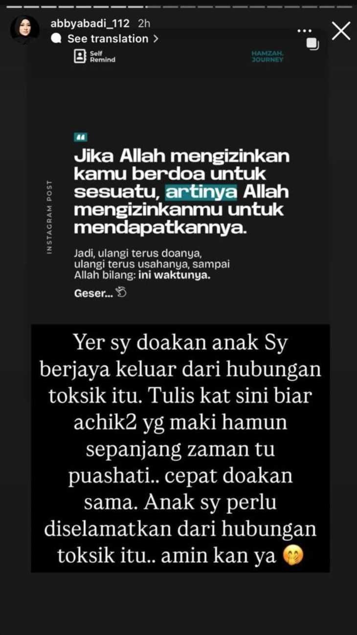 Menerusi satu Insta Story, Abby menulis mesej ringkas tetapi sarat makna: