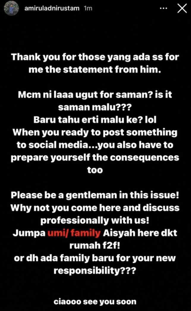 Di akhir hantarannya itu, Amirul mencabar Alif untuk datang bersemuka dengan keluarganya secara berdepan bagi menyelesaikan isu ini.