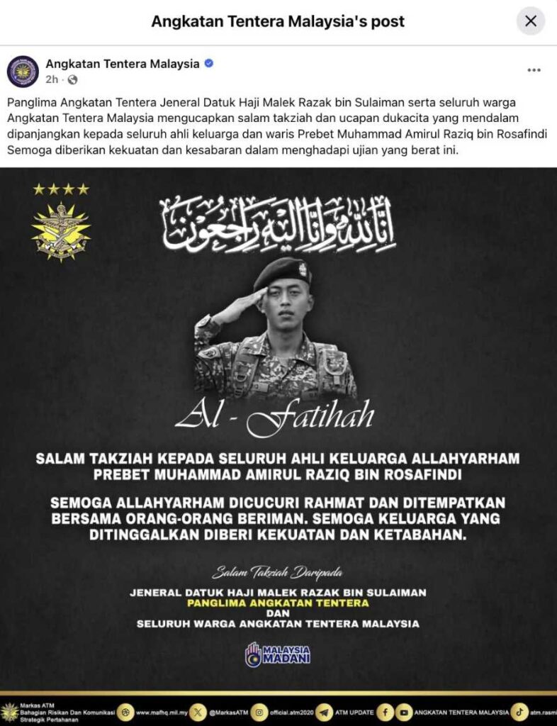 Di sebalik semua perbincangan tentang undang-undang dan tindakan, kita tidak boleh lupa bahawa Prebet Muhammad Amirul Raziq Rosafindi adalah seorang manusia – seorang anak kepada ibu bapa yang menyayanginya, seorang pemuda berusia 24 tahun yang memilih untuk mendaftar sebagai tentera demi berkhidmat kepada negara.
