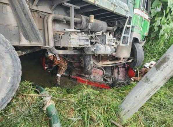 Ketika kejadian, lori tersebut telah menghempap kereta Perodua Bezza yang dinaiki oleh dua orang mangsa di dalamnya menyebabkan mangsa tersepit.