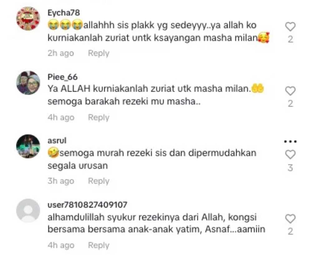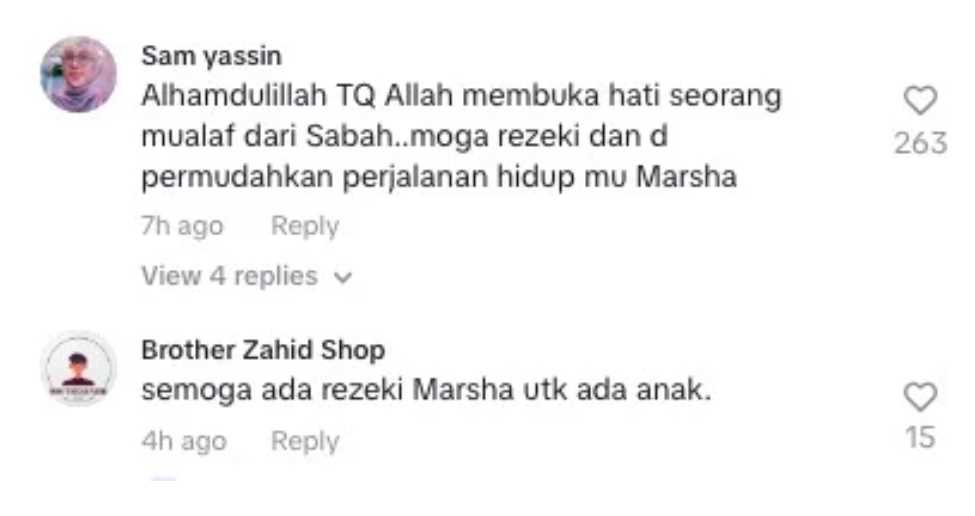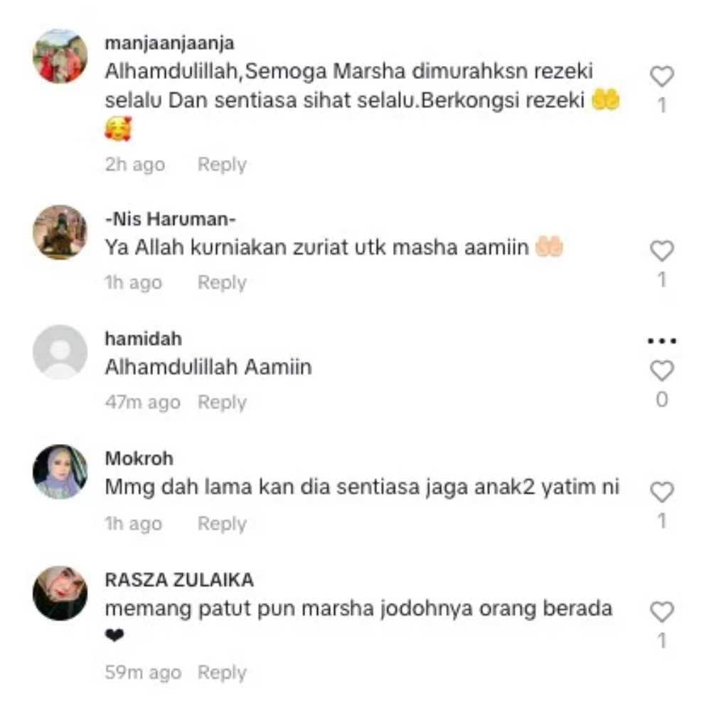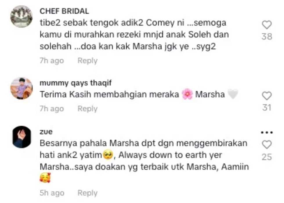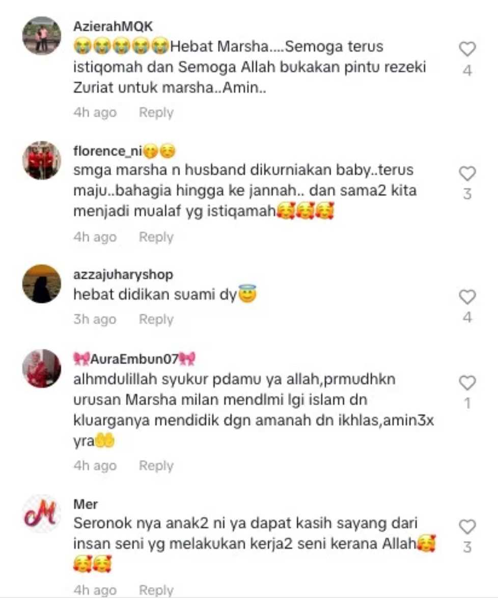 Mereka juga mendoakan agar Marsha dan suami dikurniakan rezeki zuriat kelak setelah 10 tahun berkahwin tanpa dikurniakan cahaya mata.