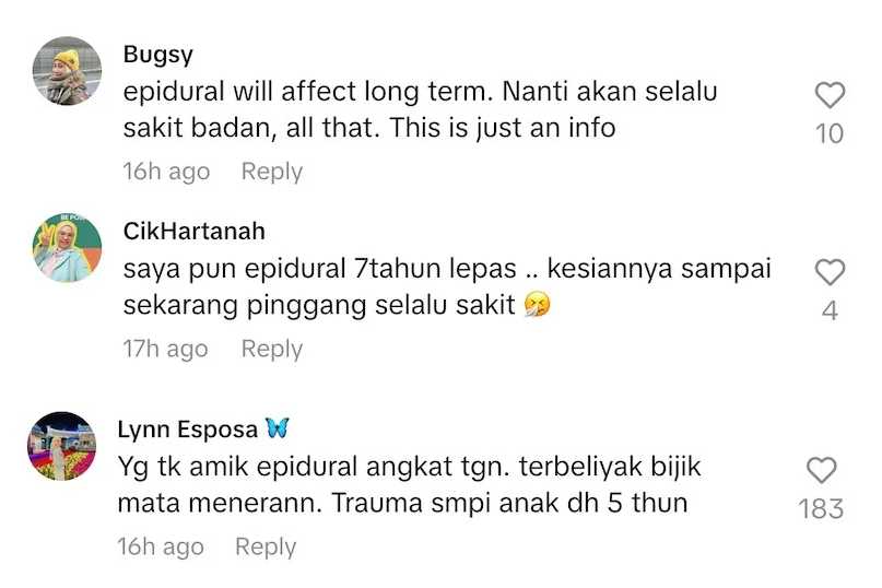 “So kalau mommy luar sana first time nak bersalin normal, for me epidural sangat penting untuk elakkan trauma dan koyak,” ujarnya lagi.