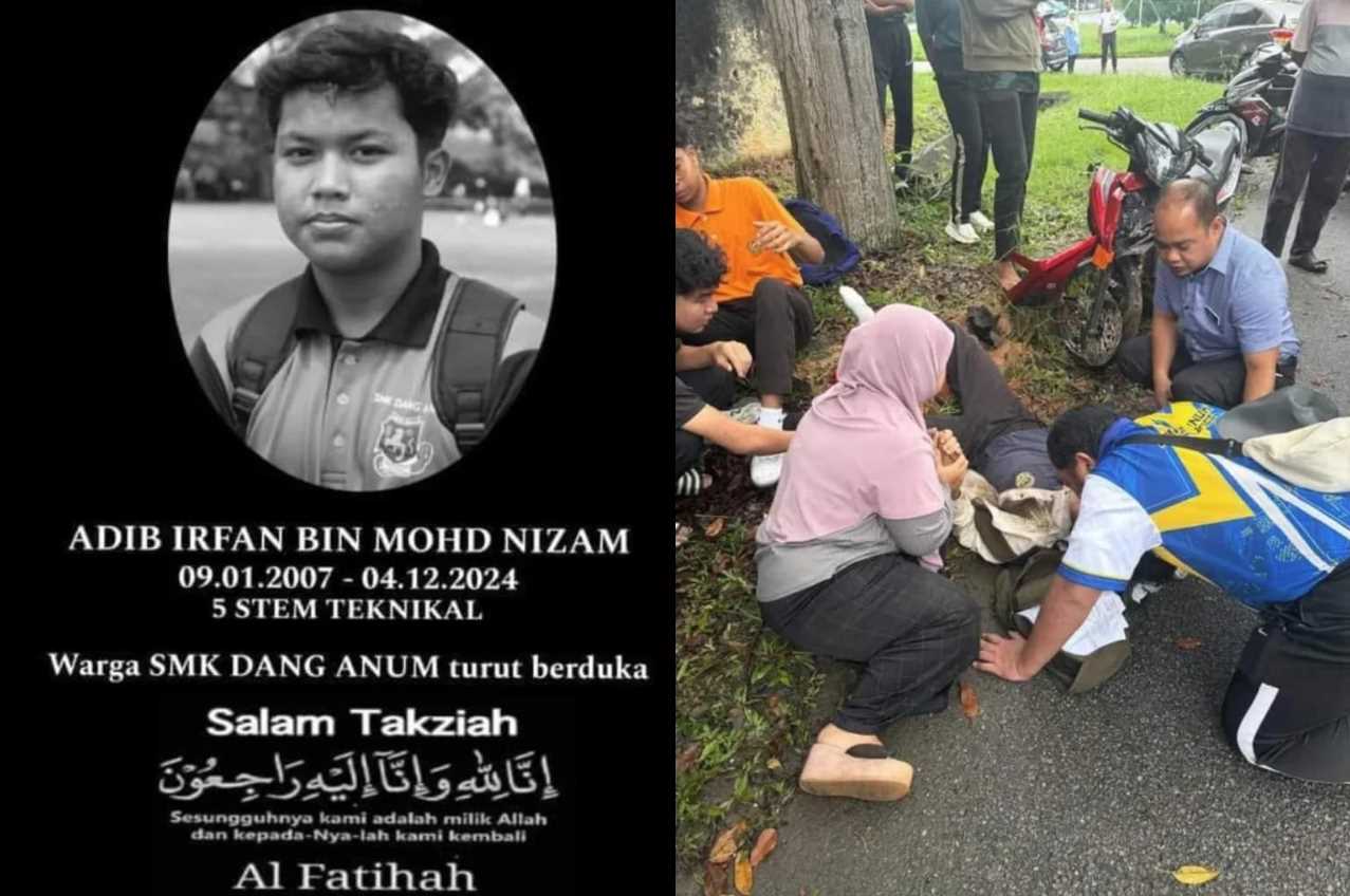 Ketua Polis Daerah Jasin, Deputi Superintendan Ahmad Jamil Radzi, berkata dalam kemalangan kira-kira 7.30 pagi itu, Adib Irfan Mohd Nizam, 17, yang merupakan pelajar Sekolah Menengah Kebangsaan (SMK) Dang Anum meninggal dunia di tempat kejadian akibat kecederaan parah pada bahagian badan.