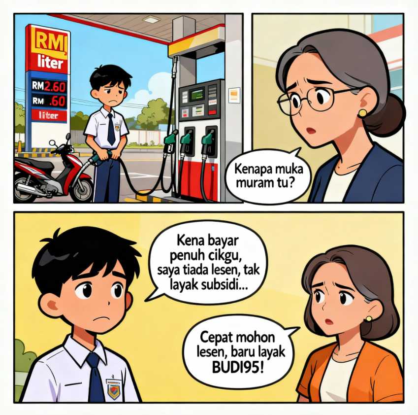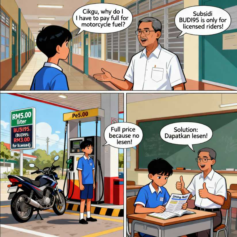 Ramai pelajar sekolah menengah terpaksa bayar penuh harga minyak motosikal kerana tidak layak subsidi BUDI95 akibat tiada lesen. Isu ini cetus perbahasan, sindiran dan jadi pengajaran agar pelajar utamakan lesen memandu sebelum nikmati faedah bantuan kerajaan.