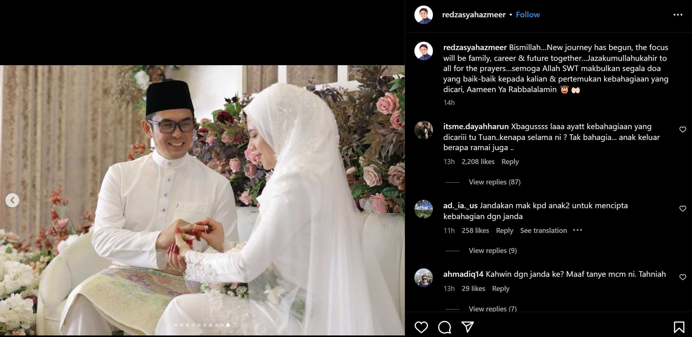 “Tahniah abang Redza dan kak Fiza. Semoga perkahwinan ini berkekalan hingga ke akhir hayat,” tulisnya menerusi kapsyen hantaran berkenaan.