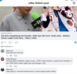 Gambar yang anda lampirkan juga memperlihatkan beberapa tangkap layar komen netizen yang bercampur antara sokongan, sindiran dan rasa ingin tahu. Ada yang menyebut Eda “suka buat anak”, ada yang mendoakan segala urusan dipermudahkan, dan ada juga yang mempersoalkan latar cerita lama. Semua ini memperlihatkan betapa nama Eda masih mempunyai kuasa untuk mencipta perbualan besar walau hanya dengan satu temubual ringkas.
