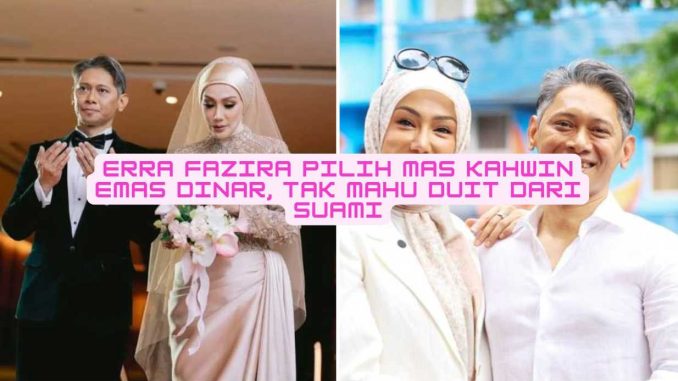 Erra Fazira mendedahkan dia sendiri yang meminta suami, ahli perniagaan Ezwan Zain, memberikan mas kahwin dalam bentuk emas dinar dan bukannya wang tunai kerana mahu menjadikannya simpanan serta aset pelaburan jangka panjang untuk dirinya dan anak, Engku Aleesya. Pilihan “tak nak duit, nak emas” ini kemudiannya tular dan menjadi inspirasi ramai bakal pengantin yang mula membuka mata tentang kelebihan emas berbanding wang kertas yang mudah susut nilai.