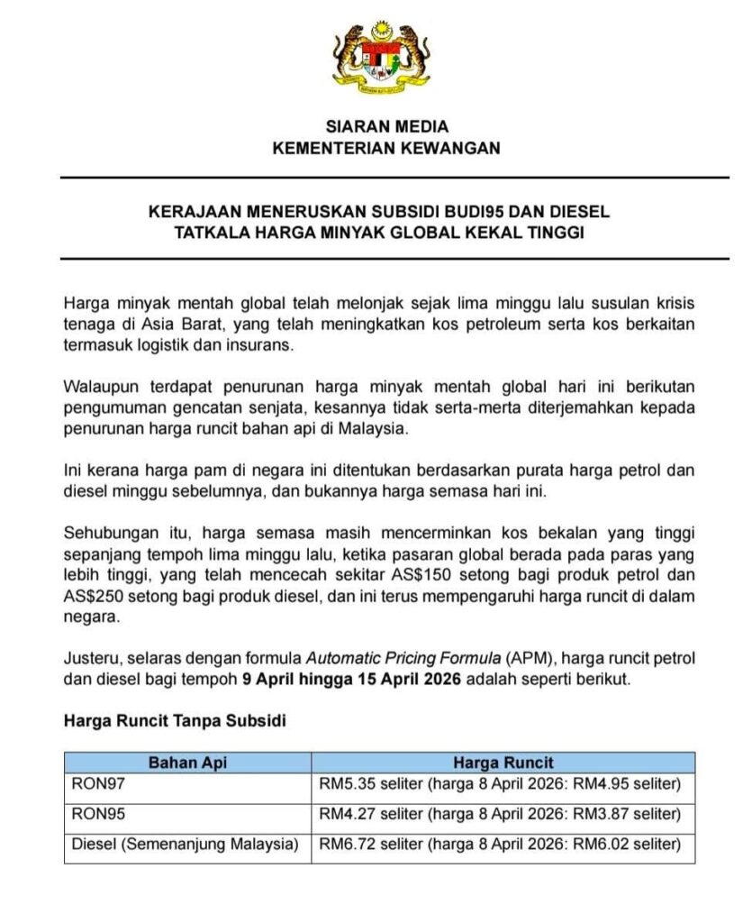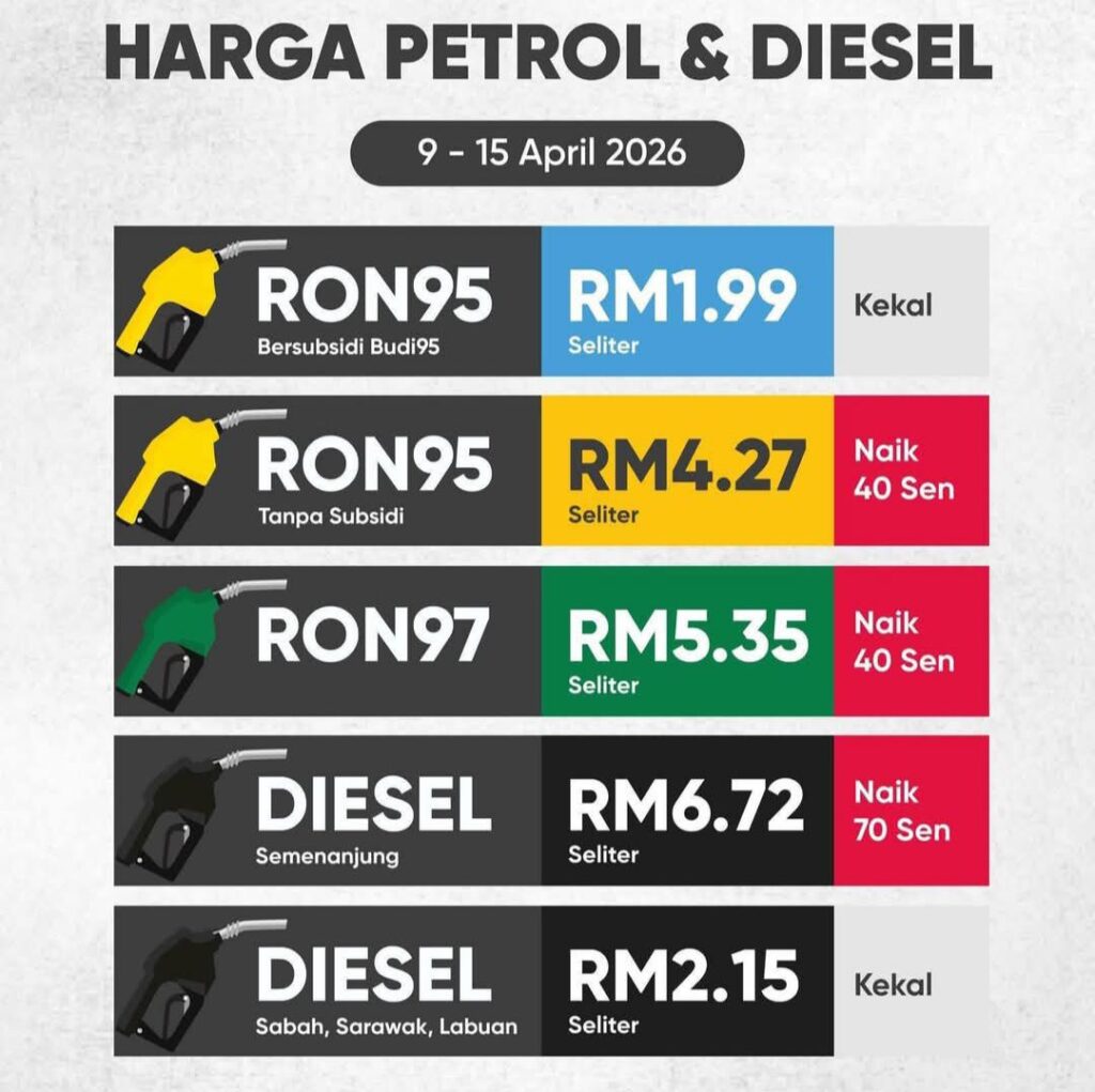 Jika dilihat pada siaran media Kementerian Kewangan bertarikh 8 April 2026, harga RON97 juga naik daripada RM4.95 ke RM5.35 seliter, dan RON95 tanpa subsidi dari RM3.87 ke RM4.27 seliter. Namun ramai yang tidak rasa “pedih” itu kerana RON95 bagi penerima BUDI95 masih dikekalkan pada RM1.99 seliter dengan had 200 liter sebulan – subsidi bersasar yang masih melindungi golongan layak.