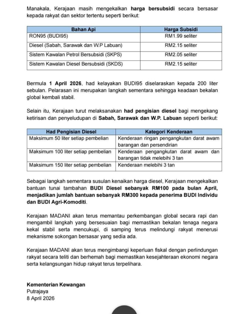 Bagi penerima BUDI95 pula, had kelayakan diselaraskan kepada 200 liter sebulan bermula 1 April 2026 sebagai langkah sementara sehingga bekalan global kembali stabil.