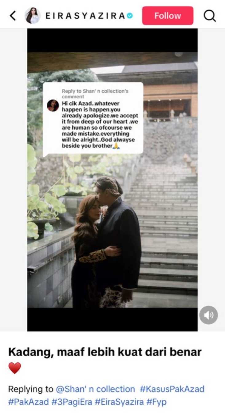 Pendekatan tenang dan matang yang ditunjukkan oleh Eira mendapat pujian ramai kerana memilih jalan kemaafan berbanding pertelingkahan.