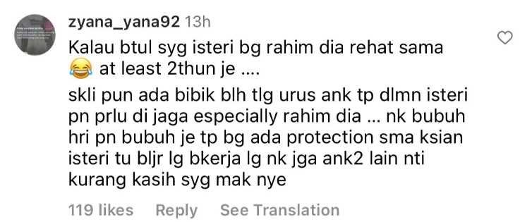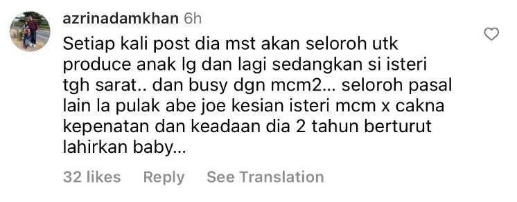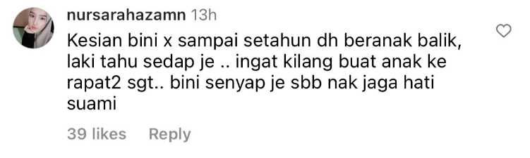 Menjengah ke ruangan komen, rata-rata netizen mengasihani isteri kepada pelakon filem ‘Air Mata Si Kudung’ itu yang perlu menjalani fasa hamil selama 9 bulan yang banyak cabarannya. Selain itu, terdapat juga segelintir netizen yang merasakan ianya bukan masalah dan merupakan satu rezeki buat pasangan itu.