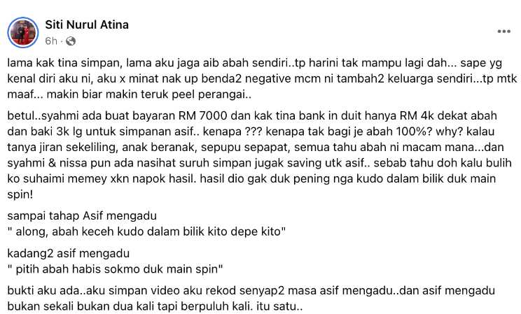 Menerusi perkongsiannya di Facebook, Atina menyatakan bapa mereka telah menggunakan duit Asif untuk membeli dadah dan juga bermain judi.