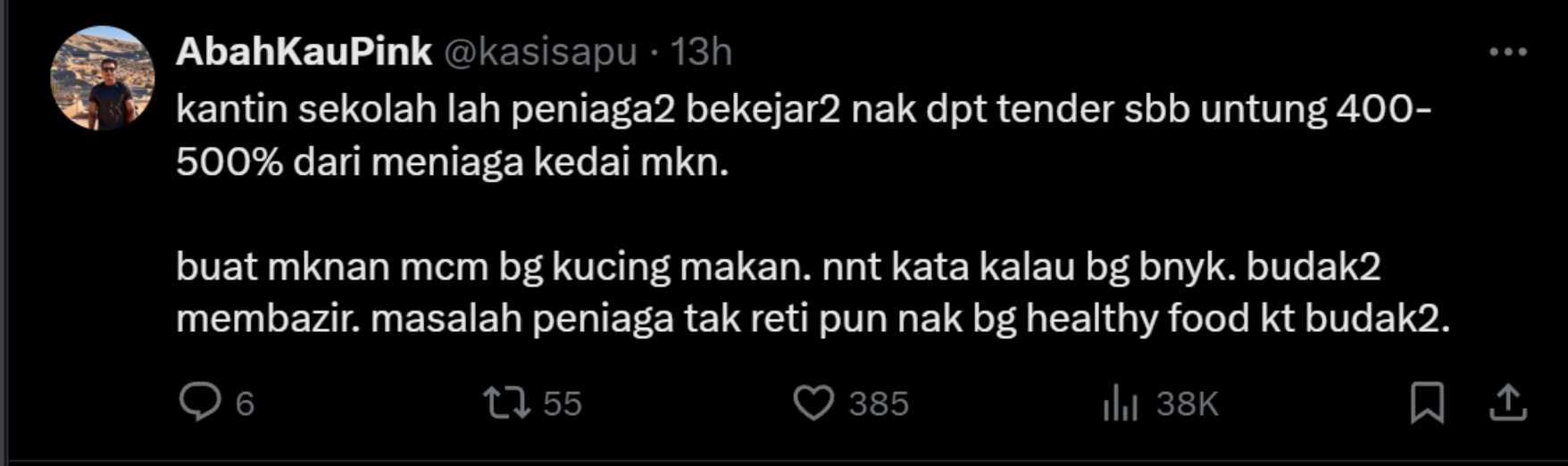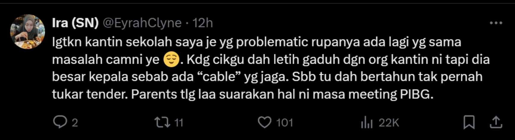 Baru-baru ini, tular di platform X apabila seorang wanita berkongsi mengenai makanan yang dijual oleh pengusaha di kantin sekolah anaknya, yang dianggap terlalu sedikit dan tidak setimpal dengan harga.