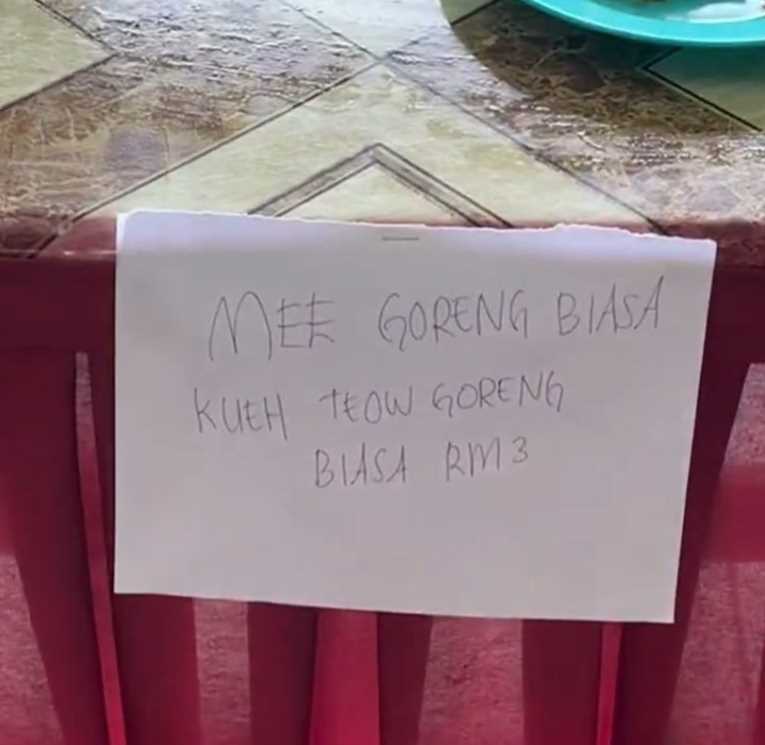 Gambar yang dimuat naik juga jelas menunjukkan harga RM3 untuk mee goreng dan kuey teow goreng, namun dengan saiz hidangan yang sangat sedikit.