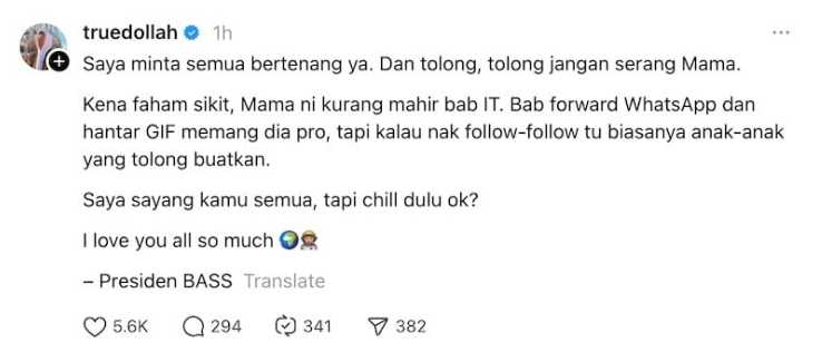 “Saya minta semua bertenang ya. Tolong jangan serang mama… Kena faham sikit, mama ni memang kurang mahir bab IT. Bab forward WhatsApp dan hantar GIF memang dia pro, tapi kalau nak follow-follow tu biasanya anak-anak yang tolong buatkan… Saya sayang kamu semua, tapi chill dulu ok?” – itulah nasihat abang Syed Saddiq kepada netizen.