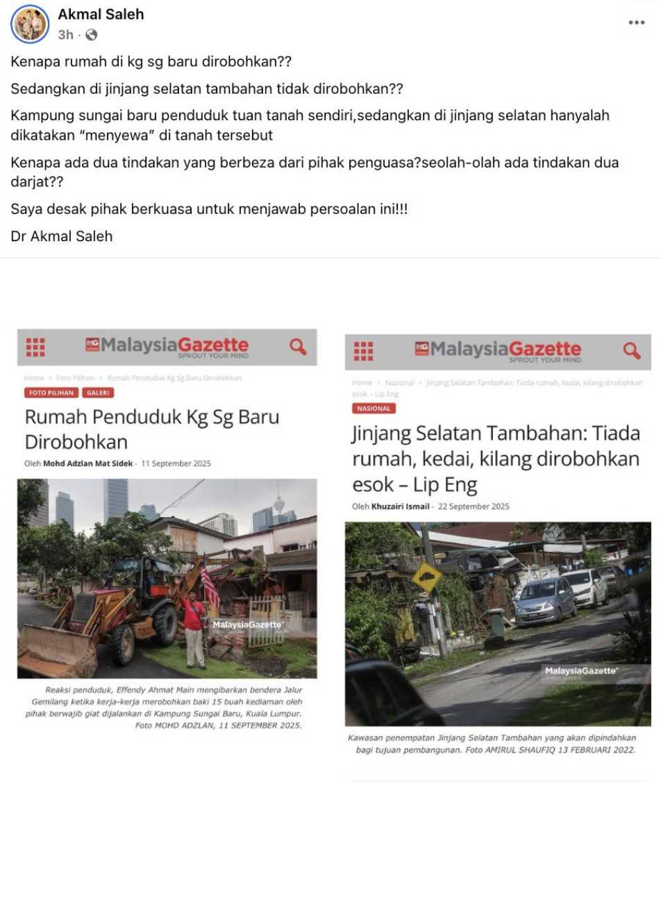Ketua Pergerakan Pemuda UMNO, Datuk Dr Muhamad Akmal Saleh, tampil mendesak pihak berkuasa untuk memberikan penjelasan berhubung tindakan yang berbeza terhadap penduduk di Kampung Sungai Baru dan Jinjang Selatan Tambahan. Isu ini timbul apabila rumah penduduk Kampung Sungai Baru dirobohkan walaupun dibina di atas tanah sendiri, manakala premis di Jinjang Selatan Tambahan yang didakwa sekadar menyewa tanah tidak dirobohkan walaupun terdapat arahan mahkamah untuk mereka berpindah.