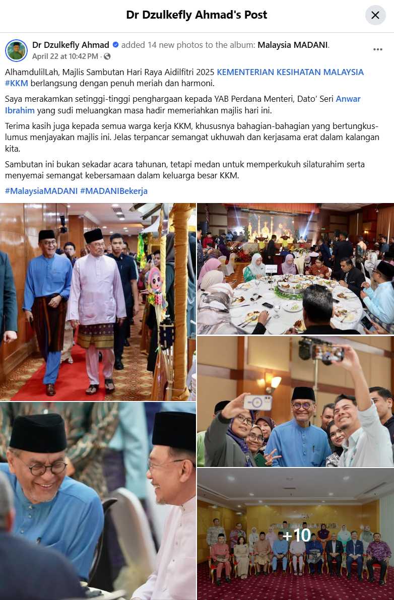 Terdahulu, Menteri Kesihatan Datuk Seri Dr. Dzulkefly Ahmad mengundang kecaman ramai selepas memuat naik foto sekitar majlis sambutan hari raya aidilfitri KKM yang berlangsung penuh meriah.