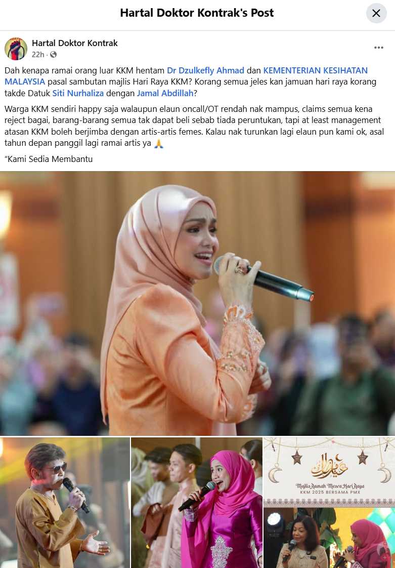 Menerusi satu hantaran di Facebook, kumpulan Hartal Doktor Kontrak (HDK) menyindir keras KKM mempersoalkan kewajaran belanja besar untuk artis sedangkan staf kesihatan masih ‘terseksa’ dengan isu elaun on-call yang belum naik, tuntutan kerja lebih masa ditolak, dan peralatan perubatan yang tak cukup.