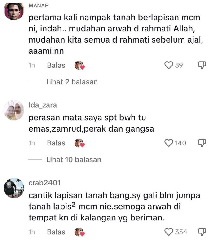 “Pandangan dari lubang kubur dia. Ia memang berlapis-lapis macam ni. Merah, coklat sikit, merah, hitam, ni kekuningan, sini hijau-hijau sikit dan membawa ke kuning. Ada lapan warna berbeza,” ujarnya.