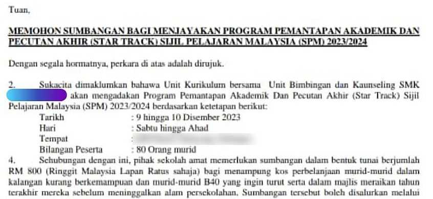 Menerusi satu perkongsian, sebuah sekolah dikatakan memohon sumbangan untuk menjayakan program akhir tahun membabitkan pelajar Tingkatan 5 di sebuah hotel.