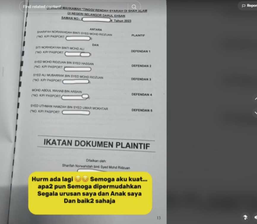 Terbaru, Hidayah menerusi satu hantaran di TikTok memuat naik surat mahkamah tertera namanya sebagai defendan.