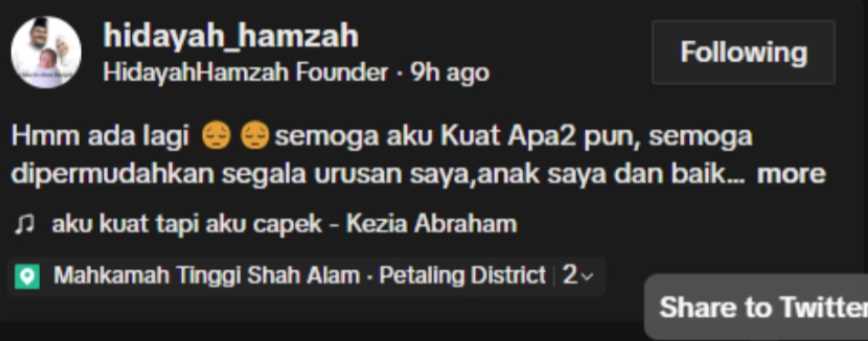 Pelawak ini mendakwa Hidayah sengaja meraih simpati dengan memuat naik dokumen mahkamah ke TikTok. Sedangkan semasa prosedur berlangsung, Hidayah tidak hadirkan diri kerana bercuti di Pulau Pinang.