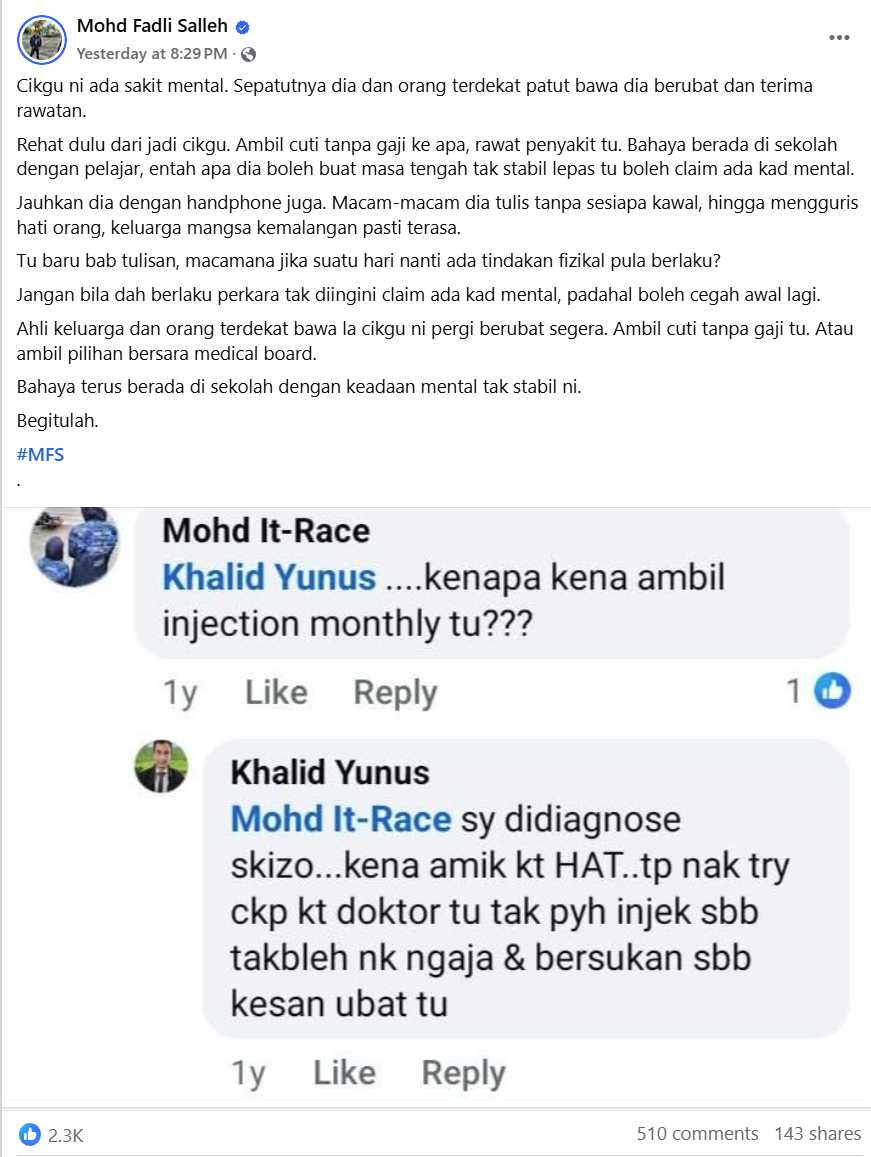 “Cikgu ni ada sakit mental. Sepatutnya dia dan orang terdekat patut bawa dia berubat dan terima rawatan.