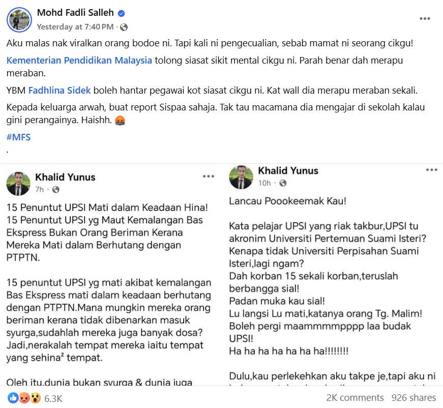 Pempengaruh serta aktivis sosial Pertubuhan Kebajikan Dana Kita, Cikgu Mohd Fadli Salleh memohon Kementerian Pendidikan Malaysia (KPM) menyiasat tindakan seorang guru biadap yang mendakwa kematian 15 pelajar Universiti Pendidikan Sultan Idris (UPSI) dalam tragedi kemalangan baru-baru ini adalah hina.