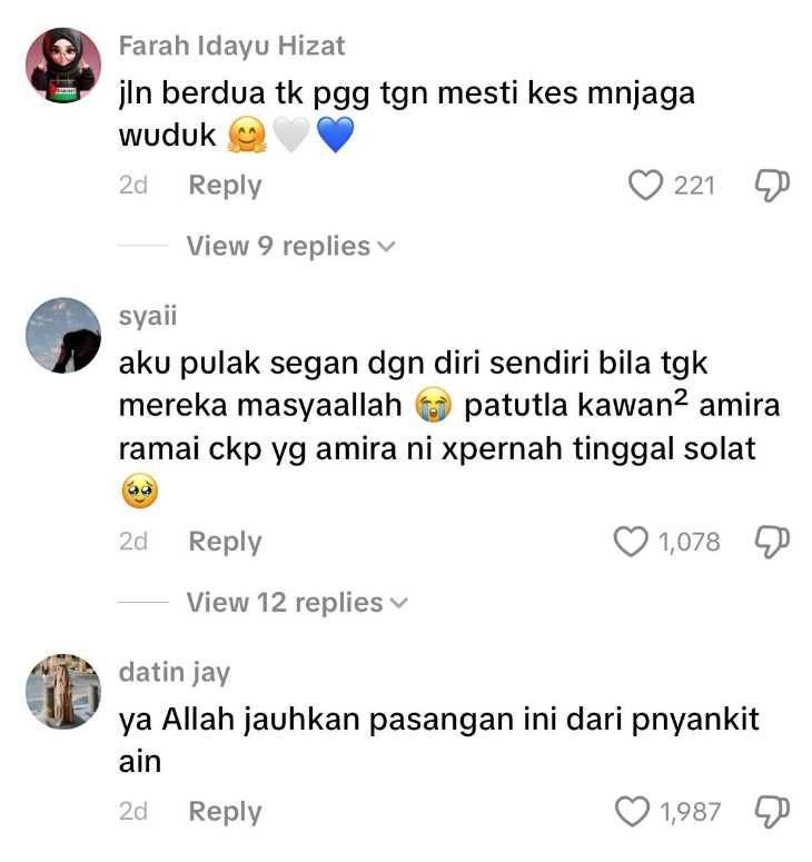 Salah satu perkara paling mendapat perhatian ialah Fattah dan Amira tidak berpegangan tangan selepas mengambil wuduk, bagi menjaga kesempurnaan ibadah mereka. Tindakan kecil tetapi bermakna ini menyebabkan netizen teruja dan sejuk hati, serta menjadikan mereka contoh pasangan selebriti yang patut diteladani.
