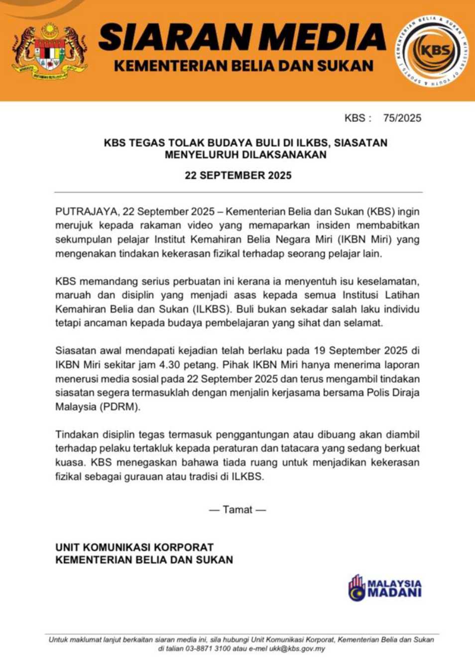 Kes buli seperti ini bukan sahaja merosakkan masa depan mangsa tetapi juga menjejaskan kestabilan sosial di kalangan pelajar dan masyarakat amnya. Oleh itu, kerjasama semua pihak amat penting untuk memastikan suasana pembelajaran yang selamat dan kondusif bagi semua.