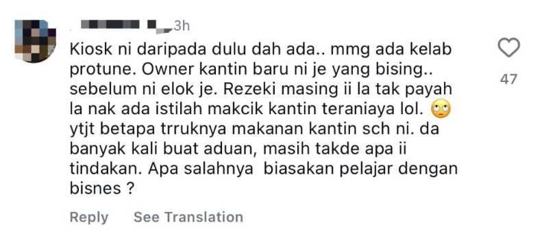 “Yang tahu je tahu, betapa teruknya makanan kantin sekolah ini. Dah banyak kali aduan dibuat, tetapi masih tiada apa-apa tindakan. Apa salahnya biasakan pelajar dengan bisnes?” kata pelajar tersebut.