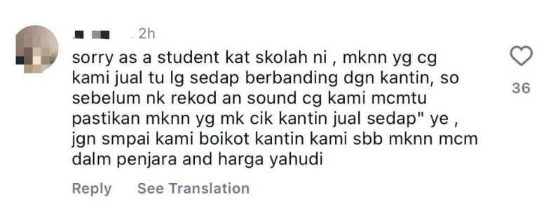 “Makanan yang cikgu jual tu lagi sedap berbanding kantin. Sebelum nak sound cikgu kami macam tu, pastikan makcik kantin jual makanan sedap ye. Jangan sampai kami boikot kantin sebab makanan macam dalam penjara dan harga yahudi,” kata pelajar lain.