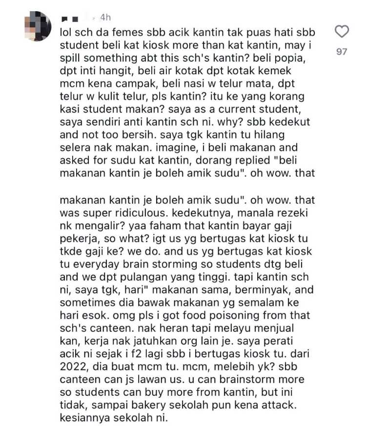 Maka dari komen itu, beberapa pelajar lain turut mendedahkan luahan ketidakpuasan hati mereka terhadap kantin sekolah yang menjual makanan tidak berkualiti dan mengenakan harga di luar kemampuan pelajar sekolah.