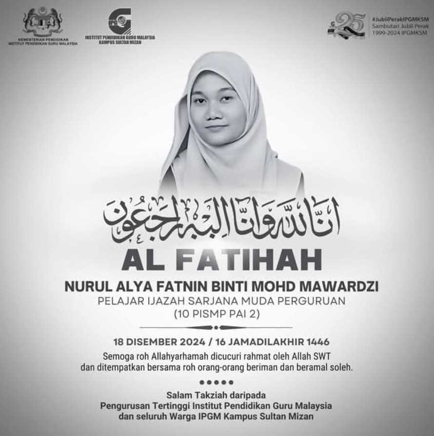 Kemalangan Meragut Nyawa Pelajar IPG: Nurul Alya Fatnin Mohd Mawardzi, 22, maut dalam kemalangan melibatkan lima kenderaan di Kilometer 16, Jalan Gua Musang-Kuala Lipis. Insiden berlaku pada pukul 6.45 pagi ketika mangsa dan 11 pelajar IPG Kampus Sultan Mizan dalam perjalanan pulang dari lawatan ke Indonesia.