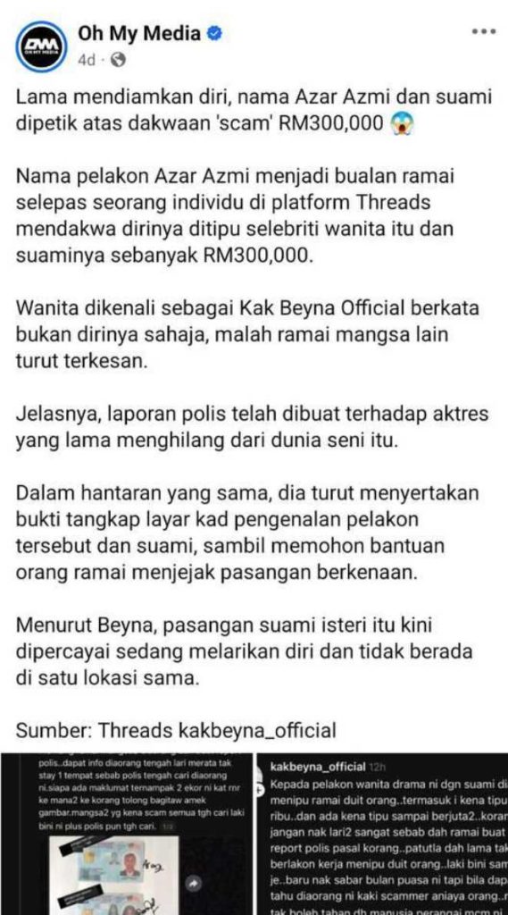 Dia mendedahkan perkara tersebut melalui Threads dengan memuat naik tangkap layar kad pengenalan pelakon berkenaan dan suaminya, selain meminta bantuan orang ramai mengesan pasangan tersebut kerana mendakwa ramai lagi mangsa lain yang masih belum membuat laporan polis.