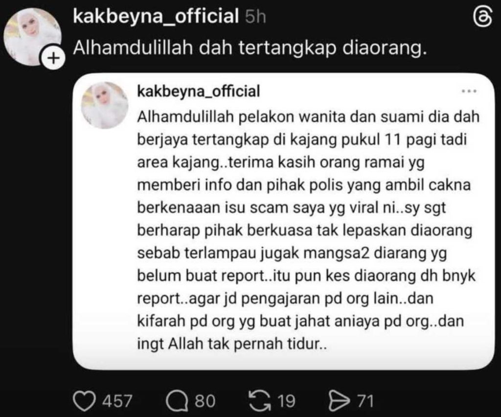 “Alhamdulillah pelakon wanita dan suami dia dah berjaya tertangkap di Kajang pukul 11 pagi tadi… terima kasih orang ramai yang memberi info dan pihak polis yang ambil cakna berkenaan isu scam saya yang viral ni,” tulisnya sambil berharap pihak berkuasa tidak melepaskan pasangan tersebut memandangkan “terlampau ramai mangsa yang belum buat report”.