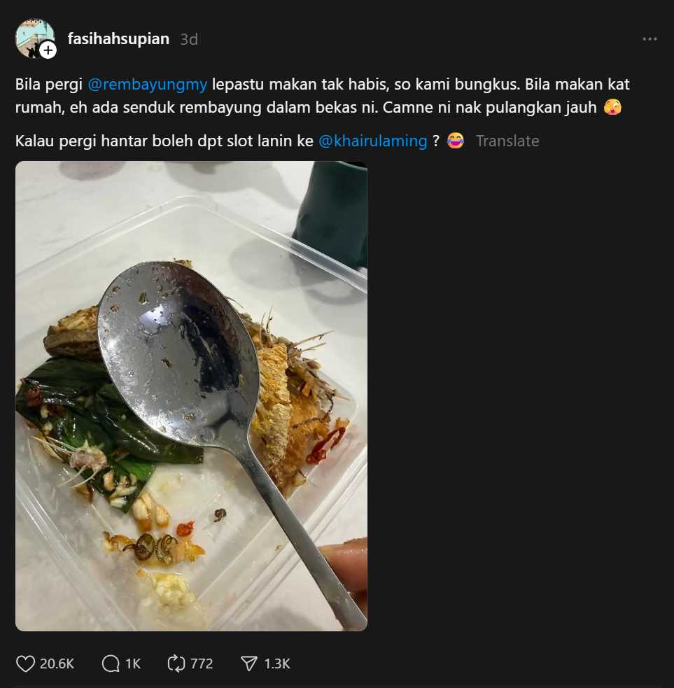 Daripada satu senduk yang tertinggal dalam bungkusan, tercipta sebuah kisah ringan tetapi sarat nilai – tentang amanah, adab berurusan dan pentingnya berlapang dada. Rembayung mungkin hanyalah sebuah restoran di Kampung Baru, namun dengan insiden seperti ini, ia terus menjadi sebahagian kecil tetapi manis dalam memori kolektif peminat Khairul Aming di seluruh negara.