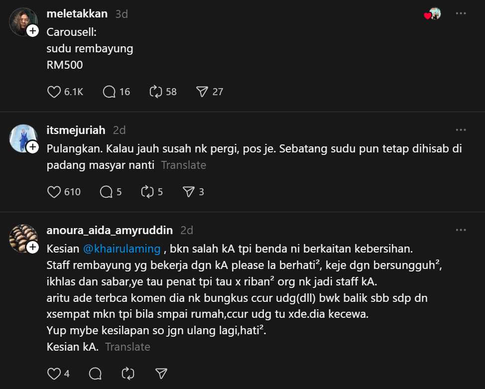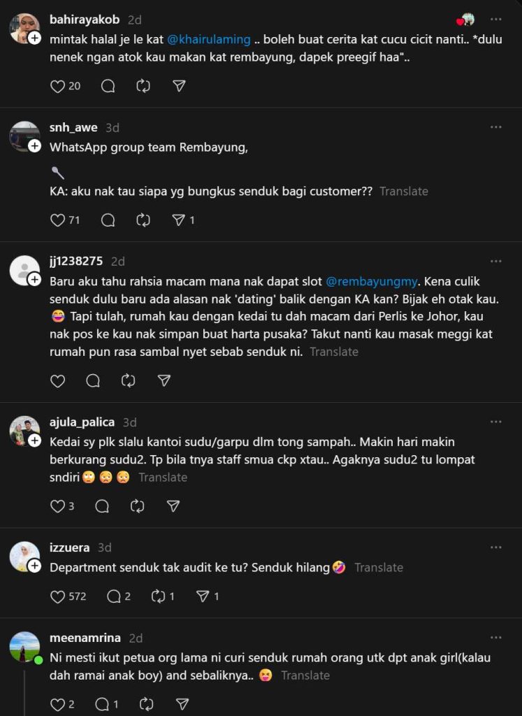 Dalam masa sama, ramai juga yang melontarkan jenaka kreatif. Ada yang bergurau mahu menjual “sudu Rembayung” di Carousell dengan harga RM500, kononnya koleksi terhad untuk peminat Khairul Aming. Ada pula mencipta dialog kononya dalam WhatsApp staf: “KA: aku nak tau siapa yang bungkus senduk bagi customer??” lengkap dengan emoji senduk.