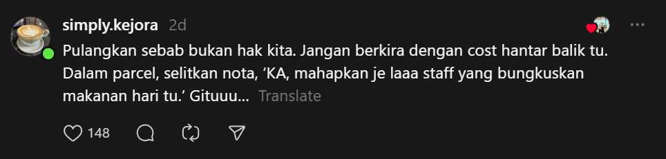 Bagi pelanggan, kisah ini mengingatkan betapa pentingnya memeriksa semula bungkusan makanan sebelum meninggalkan premis, dan jika menyedari ada barang milik restoran terbawa pulang, usaha sewajarnya perlu dibuat untuk memulangkannya – sama ada melalui pos atau ketika kunjungan seterusnya.