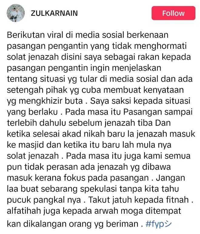 Bagi memperbetulkan salah faham, rakan kepada pengantin sendiri tampil menjelaskan hal sebenar. Sebagai orang yang berada di sana, dia berkata sebenarnya pihak mempelai sudah sampai lebih awal di sana dan barulah kumpulan jemaah itu tiba. Mereka sendiri awalnya tidak menyedari hal tersebut kerana masing-masing fokus dengan pasangan tersebut di hadapan.
