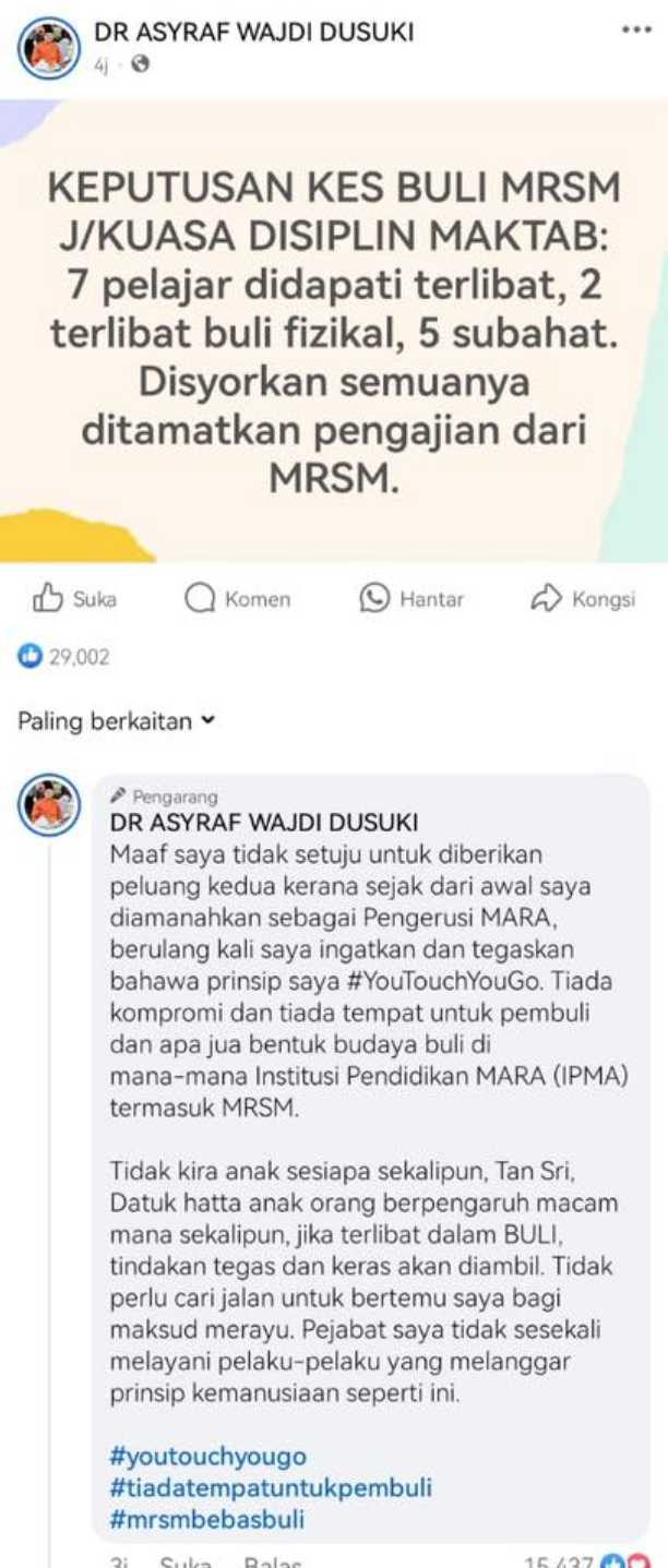 Tidak perlu cari jalan untuk bertemu saya bagi maksud merayu. Pejabat saya tidak sesekali melayani pelaku-pelaku yang melanggar prinsip kemanusiaan seperti ini. #youtouchyougo #tiadatempatuntukpembuli #mrsmbebasbuli