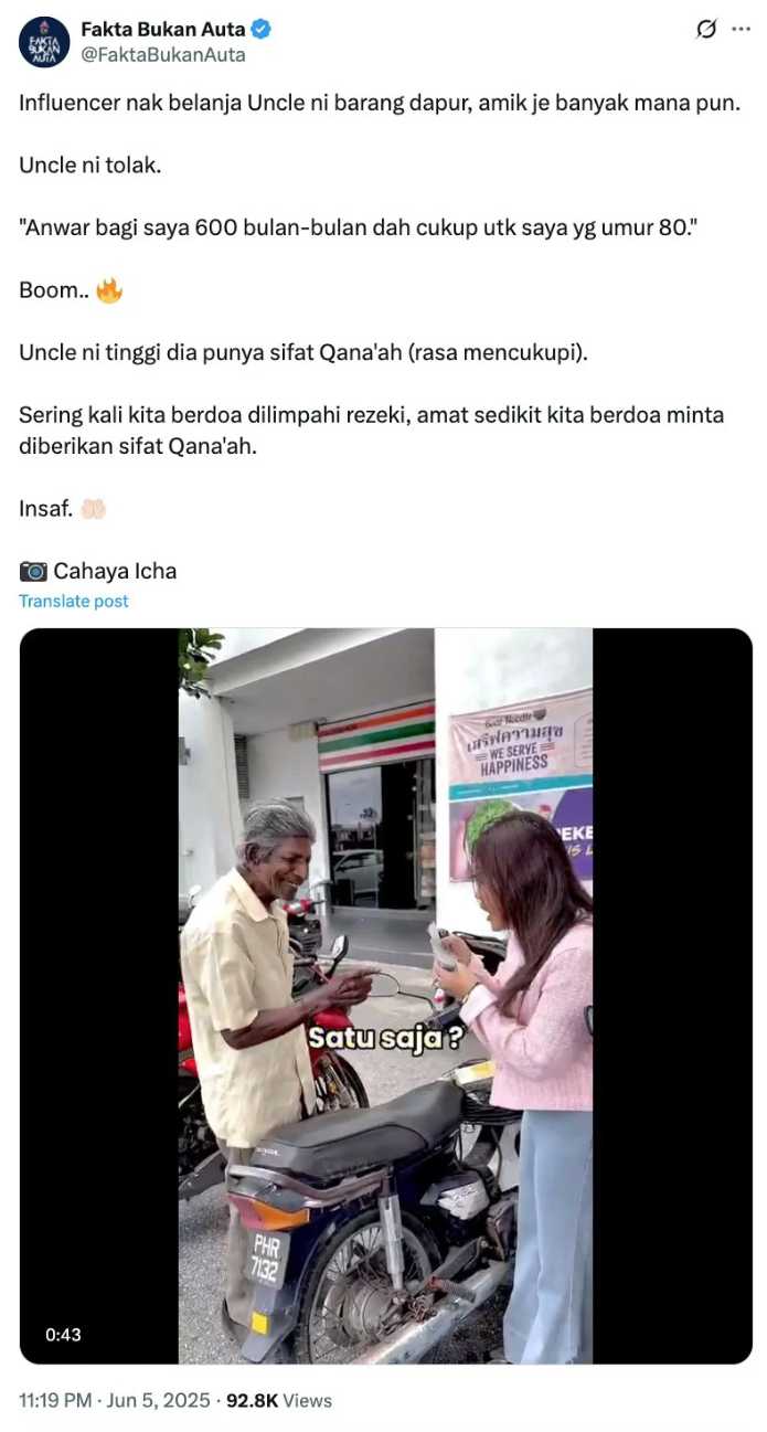 Pak cik tolak duit influencer, luah syukur atas bantuan kerajaan
