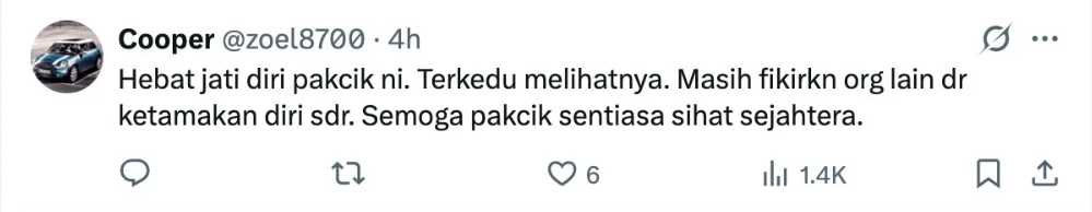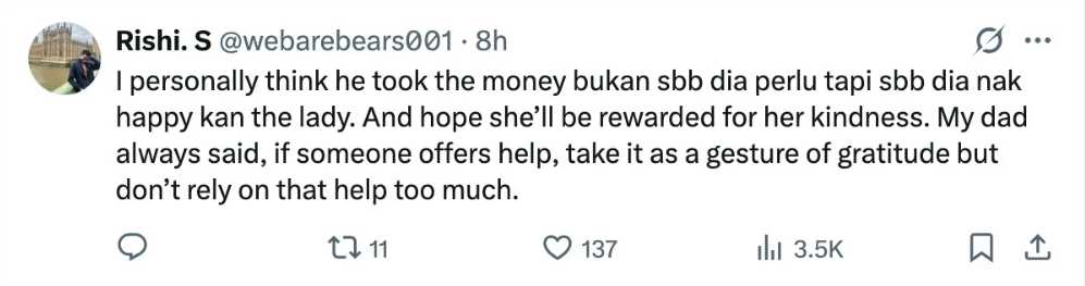 Pada masa yang sama, ramai juga yang memuji pak cik berkenaan atas sifatnya yang sentiasa bersyukur atas rezekinya malah menolak bantuan kerana rasa mencukupi dengan apa yang dia miliki.