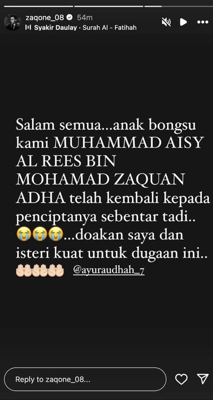 “Salam semua, anak bongsu kami Muhammad Aisy Al Rees Mohamad Zaquan Adha telah kembali kepada pencipta-Nya sebentar tadi. Doakan saya dan isteri kuat untuk dugaan ini,” ujarnya.