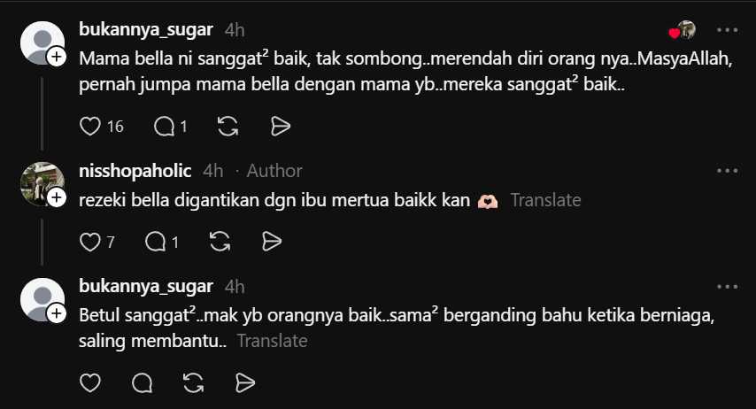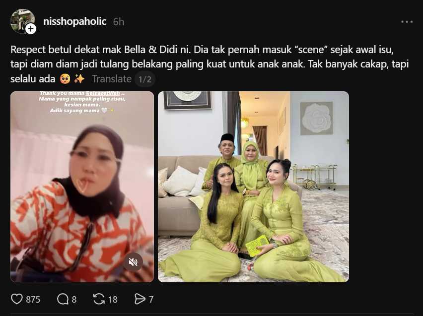 Isu ini menjadi hangat apabila beberapa hantaran dan komen di media sosial memuji sifat ibu Bella yang dianggap sangat baik, merendah diri dan tidak sombong. Dalam gambar tangkap layar yang dikongsi, ramai netizen menyebut bahawa beliau selama ini lebih banyak berdiam diri, tetapi kali ini dilihat seolah-olah “meletup” dan memberikan reaksi yang lebih tegas terhadap sesuatu yang sedang berlaku.