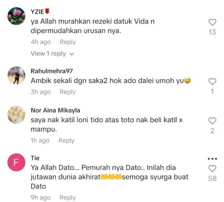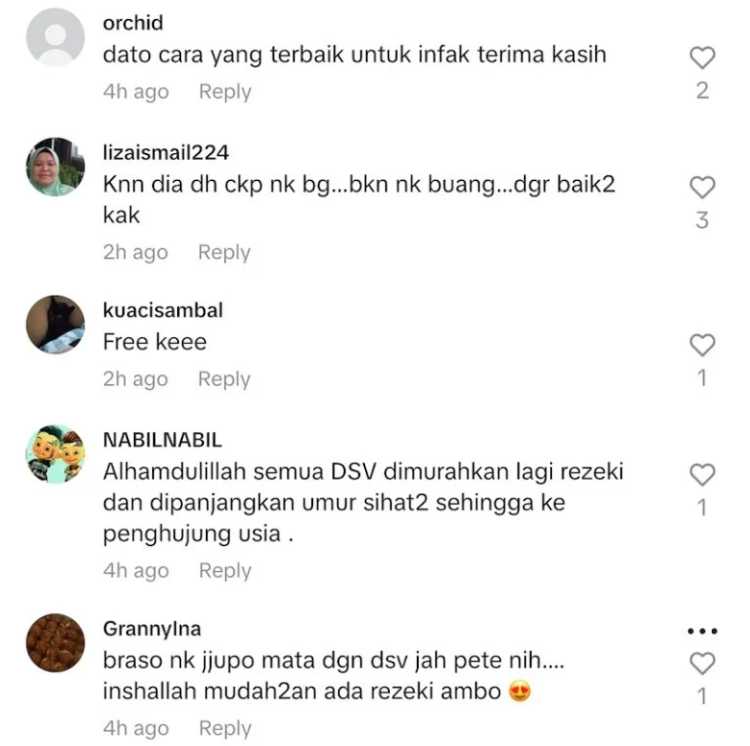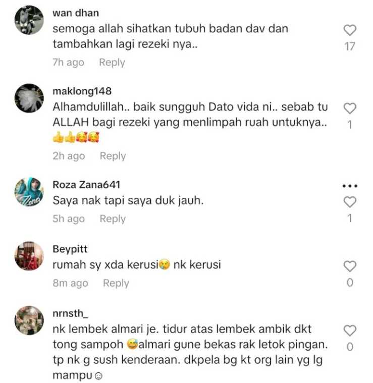 Di ruang komen TikTok, rata-rata warganet memuji kemurahan hati Vida dan berharap lebih ramai individu berkemampuan mencontohi tindakan sedekah berasaskan keperluan tersebut.