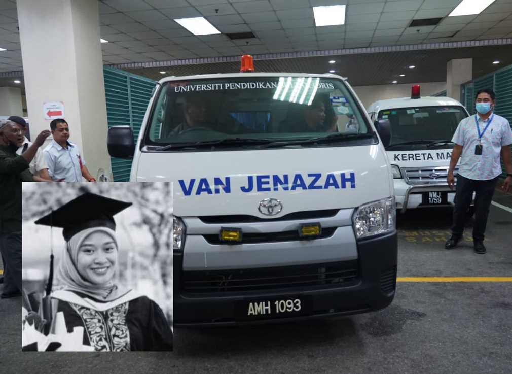 Jenazah Allahyarham dibawa menaiki van jenazah Universiti Pendidikan Sultan Idris (UPSI) diiringi kenderaan pengiring polis serta ahli keluarga beredar dari pekarangan hospital pada pukul 2.05 petang.