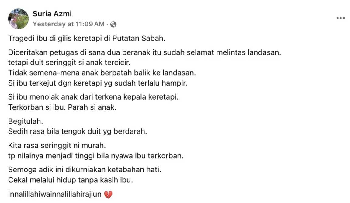 Berita tentang wanita dirempuh kereta api rupanya mahu selamatkan anak waktu mengutip RM1 yang tercicir di landasan.