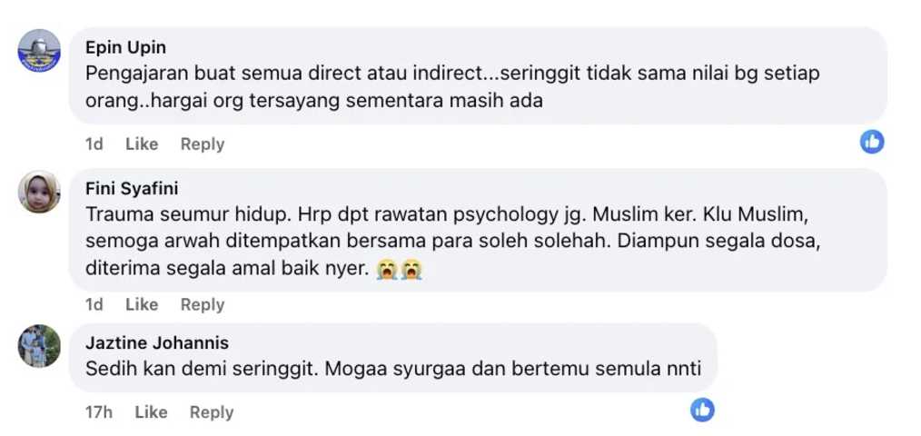 Dalam coretan yang dibuat Suria juga, dia mengatakan mungkin RM1 tidak memberi sebarang makna buat orang lain, namun berbeza buat mereka sehingga ada nyawa yang terkorban hanya disebabkan mahu mengambilnya untuk kegunaan ke sekolah.